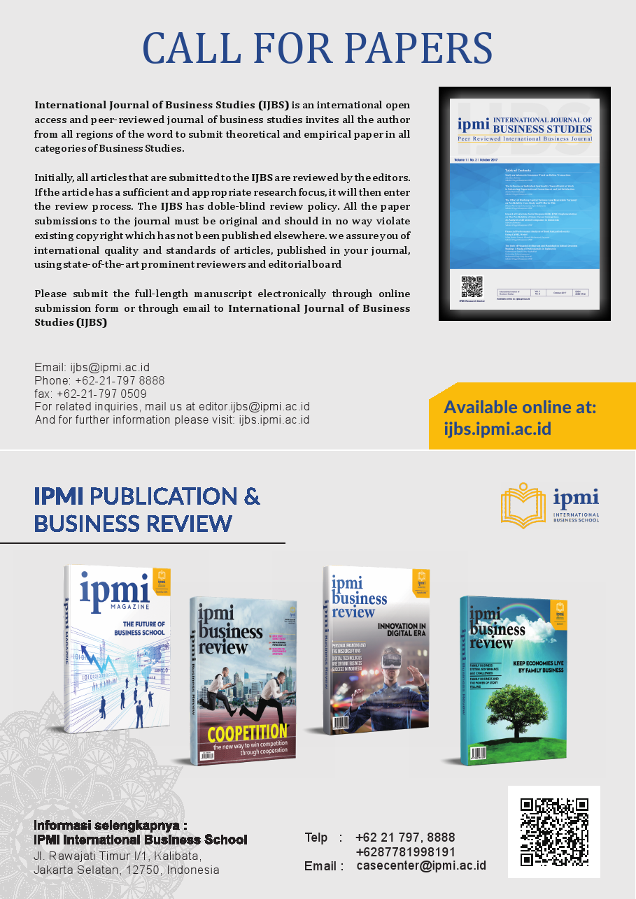International Journal of Business Studies (IJBS) is an international open access and peer-reviewed journal published tri-annually in February, June, and October by Sekolah Tinggi Manajemen IPMI. Currently, IJBS volume 6 issue 3 has been published and can be accessed through http://ijbs.ipmi.ac.id/index.php/ijbs/issue/view/29.